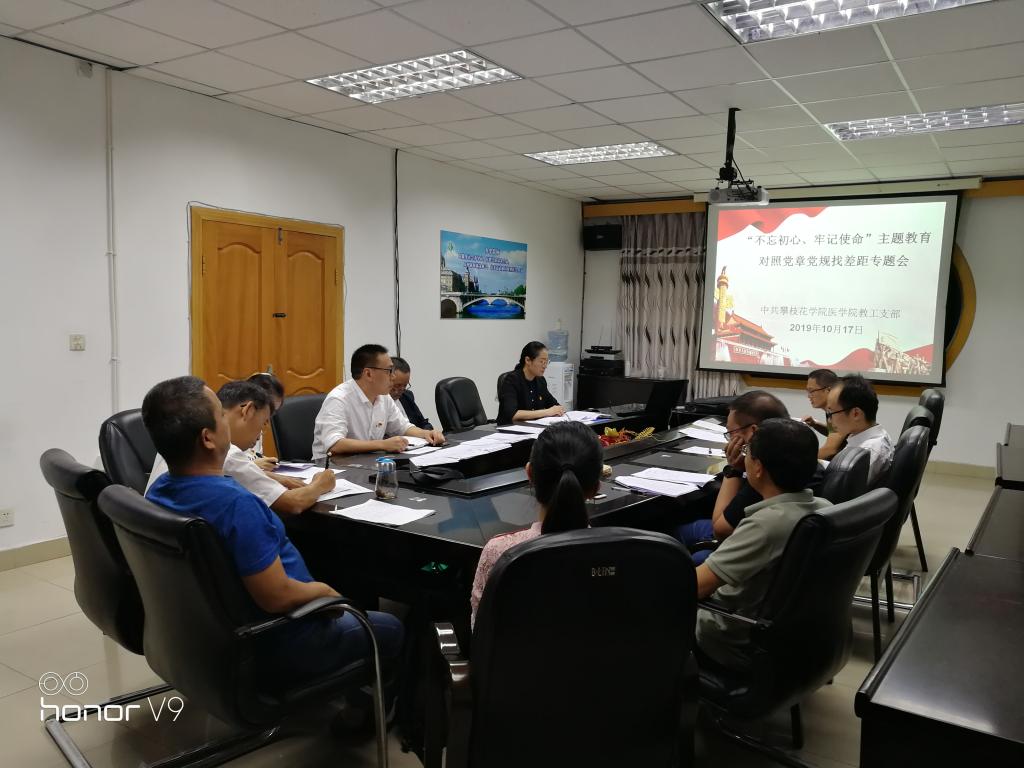 按照省委和学校党委“不忘初心、牢记使命”主题教育总体安排,围绕“守初心、担使命,找差距、抓落实”的总要求,2019年10月17日晚,医学院教工党支部在医学院西苑三楼会议室召开“对照党章党规找差距专题会议”,支部书记周建平主持会议。