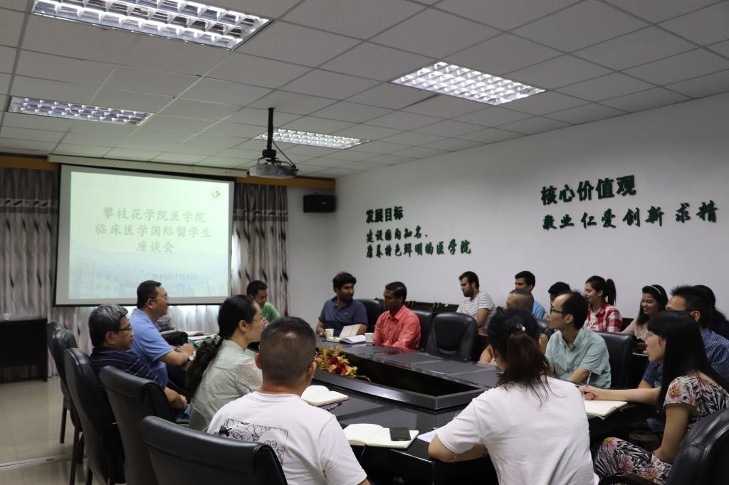 为了不断提高留学生教学质量,广泛征集广大留学生的意见和建议,推进学院留学生教育教学工作良好运行,医学院于7月3日下午,在医学院三楼会议室召开了留学生授课教师座谈会。会议由医学院院长赵牧主持,医学院相关领导和教师、国际交流学院杨凯、留学生辅导员及7名留学代表参加了会议。