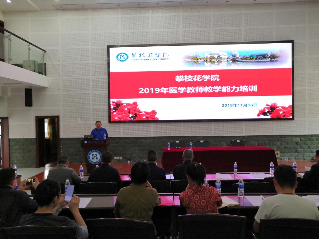 11月16日下午,我校医学教学技能培训会在图书馆学术报告厅举行。培训会由医学教师发展分中心承办,特邀空军军医大学王亚云教授、浙江台州学院医学院院长梁勇教授为培训主讲,基础医学院、附属医院(临床医学院)、攀枝花市中心医院(第二临床医学院)、攀钢集团总医院、攀枝花市第三人民医院相关领导和教师150余人参加培训。会议由基础医学院院长赵牧主持。