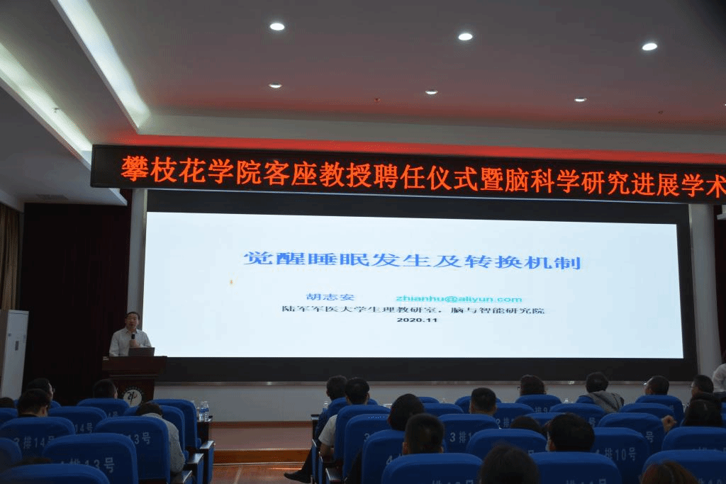 第二位讲者胡志安教授,现为第三军医大学博士生导师、生理教研室主任、中国生理学会理事、中国睡眠研究会睡眠生理和药理专业委员会主任委员,主要从事睡眠、觉醒以及生物钟、生物节律等领域研究,是我国睡眠研究领域的重量级专家。胡志安教授多年来关心攀枝花的脑科学建设,已5次莅临攀枝花学院指导科研教学工作,胡志安教授作了《脑觉醒本质》的精彩报告,为脑科学的建设指明了发展方向,报告完后,大家交流讨论,气氛热烈,与会者觉得意犹未尽。
