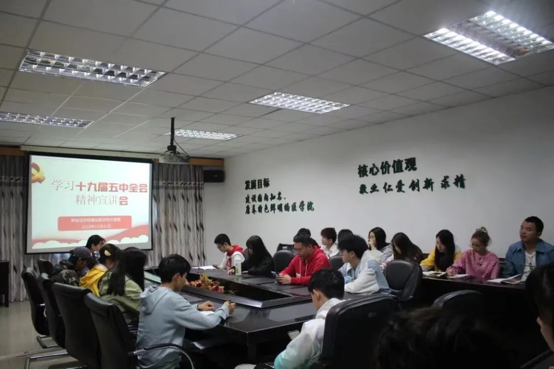 11月21日上午,我院分团委团支书书记樊安方于西苑办公楼三楼会议室召开党的十九届五中全会精神宣讲会,参加本次会议的有主席团全体成员、各班的团支书及组织委员。