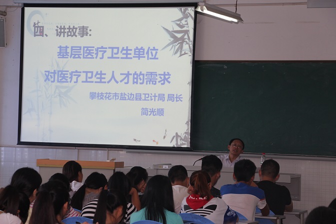 | 9月11日上午,医学院有幸邀请到盐边县卫计局简光顺局长来到西苑笃行楼,为2016级新生开展第一次道德讲堂活动。 简局长首先给新生介绍了目前正在开展的卫生事业综合改革进展,分析了改革政策对医疗单位人才需求和引进的影响;接着介绍了基层各类医疗卫生单位对医学人才的具体需求情况,对医学生素质能力的要求,各种医学生就业途径和职业成长规划模式,鼓励大家在校学好专业知识和技能,立志扎根基层,更好地服务群众,成就自身价值。简局长的报告结束后,新生同学们踊跃发言提问,有关心基层待遇的,有关心县级医院招聘条件的,有询问全日制和其他类型学历认可情况的,有咨询不同医疗卫生机构之间人员流通渠道的。简局长对同学们的问题都给出了详细的解答,他的讲话赢得了现场多次的掌声。 这次入学教育,让新入校的同学初步理解了医护人员应承担的角色义务,了解了自己将来的职业生涯状况,对培养大家努力学习、立足基层、服务群众的职业品德打下了良好的思想基础。