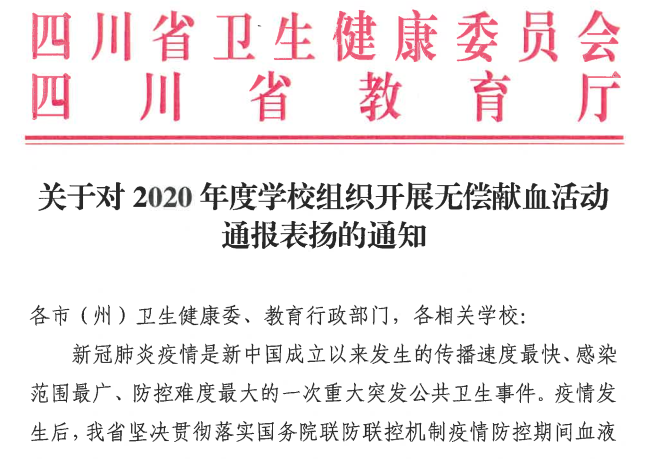 近日,四川省卫生健康委员会、省教育厅印发了《关于对2020年度学校组织开展无偿献血活动通报表扬的通知》,对2020年度在无偿献血工作中表现优异、成绩突出的98所学校予以表扬,其中攀枝花学院获得四川省无偿献血活动通报表扬。