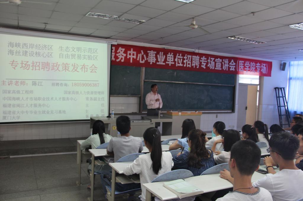 5月9日下午,福建省闽江人才服务中心主任陈江一行来到医学院,在西苑笃行楼J2-1开展了福建省闽江人才服务中心事业单位招聘专场宣讲会。医学院党委副书记陈恺、团委书记任娟以及2018届学生220余人参加了本次宣讲会。
