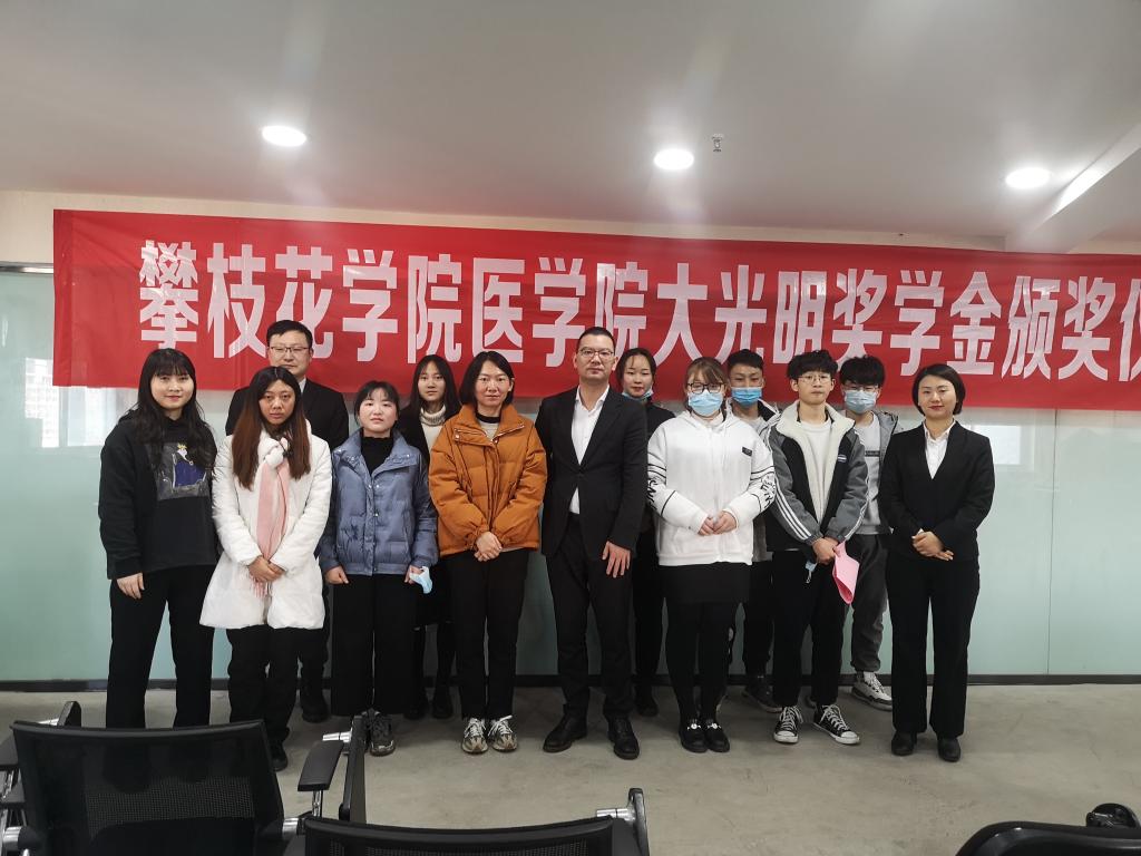 119日,攀枝花学院医学院大光明奖学金颁奖大会在成都大光明眼镜有限公司举行。四川大光明有限公司总经理陈成安、视光经理王翔宇,人事部经理李阳阳、医学院学生科长任娟、辅导员黄译萱以及眼视光技术专业学生16人参加了颁奖大会。本奖学金由四川大光明眼镜有限公司设立,皆在鼓励在校期间和实习期间表现优秀的学生。